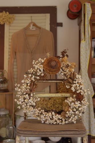 そんな皆様に楽しんでいただこうと手作りリースをサビたりしたJunkなモノ達と一緒に飾りました。